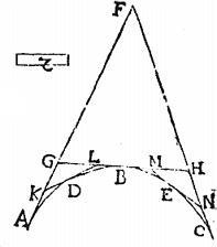 Capiantur duo latera columnae erecta super rectas AF, FC, et portio cylindricae superficiei super arcum ABC, quae superficies utraeque terminantur ad latera cylindri erecta super puncta A, C; quae latera sunt contactus superficierum planarum super AF, FC positarum cum superficie cylindrica posita super arcum ABC; itaque demonstrandum est, quod plana superficies AFC maior est cylindrica superficie ABC; hoc enim ostenso, sequitur, totam columnarem planam superficiem maiorem esse tota cylindrica superficie. Itaque sit, si possibile est, plana superficies AFC minor cylindrica superficie ABC; sectoque iterum arcu ABC, atque iterum ducantur tangentes circulum, donec relictae portiones inter tangentes, et peripheriam sint minus spatio Z, quo superficies cylindrica ABC excedere supponitur planam AFC: eritque a fortiori, eadem superficies cylindrica ABC maior, quam superficies plana posita super AK, KL,LM, MN, NC, una cum portionibus relictis: Quod est contra quartum postulatum. Non igitur minor est superficies plana AFC, superficie cylindrica ABC. Similiter nec aequalis esse demonstrabitur. Maior igitur erit;Quod est propositum.