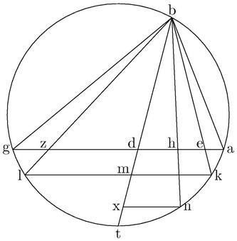 Sit triangulum ABG rectilineum; et ab angulo B ad basim AG descendant plures lineae; ex quibus ipsa BD secet angulum ABG per medium ipsae; autem BE, BZ suscipiant angulos ABE, GBZ, hinc inde aequales, ipsa73 demum BH ipsis BD, BE intersit. Dico iam quod BD ad74 mediam proportionalem inter segmenta AD, DG minorem habet rationem75, quam BH ad mediam proportionalem inter AH, HG; et BH, ad mediam proportionalem inter AH HG minorem habet rationem, quam BE ad mediam proportionalem inter AE, EG; item quod BE ad mediam proportionalem inter AE, EG eamdem habet ratiooem76 quam BZ77 ad mediam proportionalem inter AZ, ZG. nam si trianguli78 ABG latera AB, BG sint aequalia. tunc quoniam BD perpendiculariter79 est ad basim; et perinde minima descendentium. Et80 per 5. 2. Elementorum Euclidis, rectangulum ADG maximum est81 eorum, quae sub ipsius82 AG segmentis continentur; et perinde cum media proportionalis possit rectangulum sub segmentis contentum83; media proportionalis inter AD, DG segmenta maxima sit mediarum84 proportionalium inter segmenta sumptarum propterea iam BD ad talem mediam proportionalem minimam habebit rationem earum, quas habent descendentes ad medias proportionales factorum in basi segmentorum. item cum lineae BE, BZ sint aequales, ipsae85 AE, ZG aequales; et perinde rectangulum AEG et86 rectangulum AZG aequalia, et ob id mediae proportionales talium segmentorum aequales. iam et ipsae BE, BZ eamdem habebunt rationem ad ipsas medias proportionales. et eodem argumento BH ad mediam proportionalem inter AH, HG, minor erit proportio87 quam BE ad mediam proportionalem inter AE, EG. quemadmodum proponitur demonstrandum. Quod si trianguli88 ABG latera AB, BG fuerint inaequalia; tunc per 5. 4. Euclidis, triangulo ABG circulus circumscribatur ABGLK; et ipsae BD, BE BZ, BH productae coincidant peripheriae apud t, k, l, n89 puncta; coiniuncta90 KL occurrat ipsi DT apud M; et ei aequidistans NX. eruntque arcus AK, LG aequales; quandoquidem aequos91 suscipiunt angulos: et ideo ipsae AG, [C:19v] KL, NX aequidistantes. quare per 2. 6. Euclidis, BH ad HN, sicut BD ad DX. maior autem est ratio92 BD ad93 DX, quam BD ad DT94. ergo maior est ratio95 BH ad HN, quam BD ad DT96. et propterea maior est ratio97 BH ad mediam proportionalem inter BH, HN; quam98 BD ad mediam proportionalem inter BD DT: quandoquidem si maior est dupla, quam dupla; maior est et simpla, quam simpla99. verum media proportionalis inter BH HN est et media proportionalis inter AH, HG; quoniam rectangulum contentum sub his aequale est rectangulo contento sub illis per 34. 3. Euclidis: et similiter, media proportionalis inter BD, DT est ipsa media proportionalis inter AD, DG. igitur ratio100 BH maior est101 ad mediam proportionalem inter AH, HG; quam BD ad mediam proportionalem inter AD, DG. item BD ad DM, hoc est BE ad EK est102 maior proportio103, quam BD ad DX; hoc est BH ad BN104; et [S:175] ideo BE ad105 mediam proportionalem inter BE, EK; hoc est mediam proportionalem inter AE, EG maior erit106 proportio107 quam BH ad mediam proportionalem inter BH, HN; hoc est mediam proportionalem inter AH, HG. Denique sicut BE ad EK, sic BZ, ad ZL; utraque enim est108 sicut BD ad DM. igitur sicut109 BE ad mediam proportionalem inter BE, EK; hoc est mediam proportionalem inter A110E, EG; sic iam BZ ad mediam proportionalem inter bz, zl; hoc est mediam proportionalem inter111 AZ ZG112. Quae fuerant demonstranda. Et manifestum fuit quod quadratum BD minorem habet rationem ad rectangulum ADG, quam quadratum BH ad rectangulum AHG. quodque quadratum BH minorem habet rationem ad rectangulum AHG, quam quadratum BE ad rectangulum AEG. quodque quadratum BE ad rectangulum AEG est113, sicut quadratum BZ ad rectangulum AZG. idemque dicendum si pro rectangulis segmentorum sumas quadrata mediarum proportionalium114.